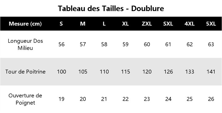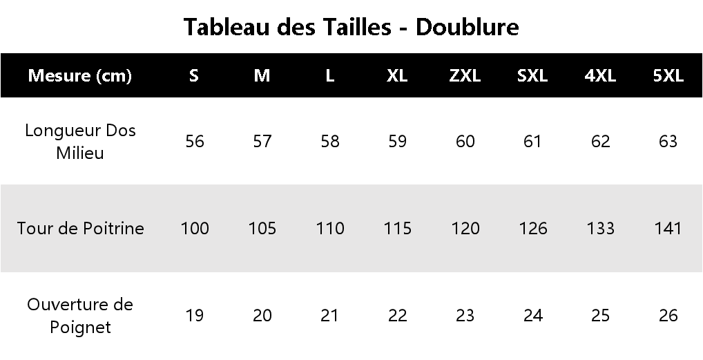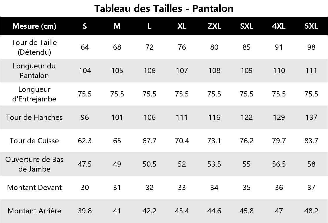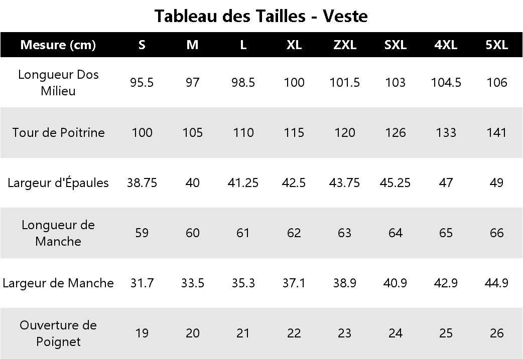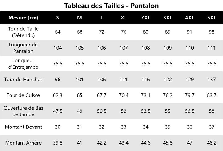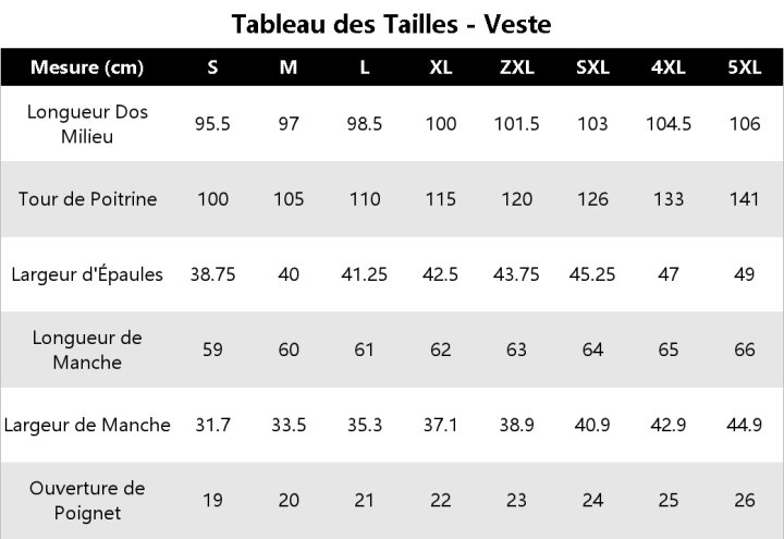 Tailles : S, M, L, XL, 2XL, 3XL, 4XL, 5XL