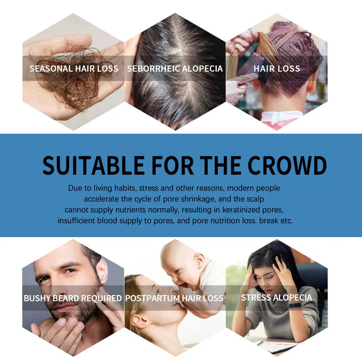 Idéal pour les personnes souffrant de perte de cheveux saisonnière, d'alopécie séborrhéique, de perte de cheveux due au stress ou de perte post-partum. Également parfait pour ceux qui souhaitent faire pousser une barbe plus fournie.