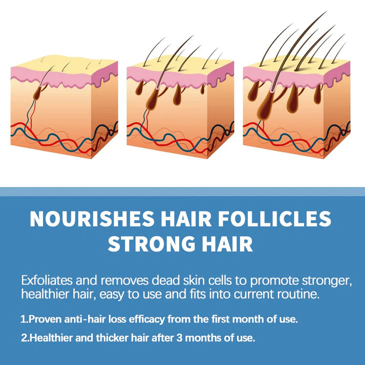 Nourrit efficacement les follicules pileux, exfolie les cellules mortes et améliore le microenvironnement du cuir chevelu, augmentant la vitalité des follicules pour des cheveux plus forts.