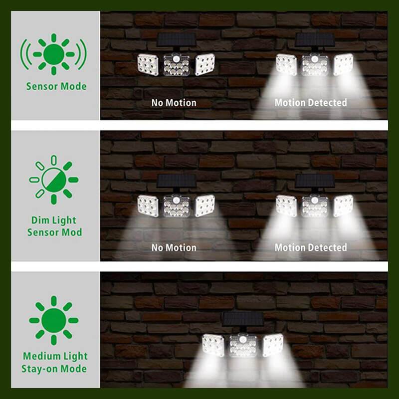 - Essayez cette lampe murale à capteur solaire LED à trois têtes ! Alimentation solaire, chargement automatique pendant la journée et éclairage automatique la nuit, économie d'énergie et protection de l'environnement, large gamme de lumière, haute luminosité, projecteur rotatif à 360 degrés, détection automatique du corps, bonne résistance aux intempéries, conçu pour une utilisation en extérieur, vous pouvez donc l'utiliser avec plus de confiance !