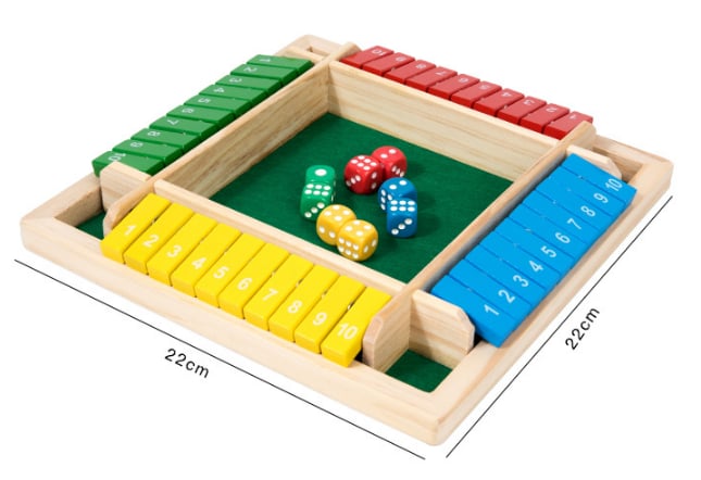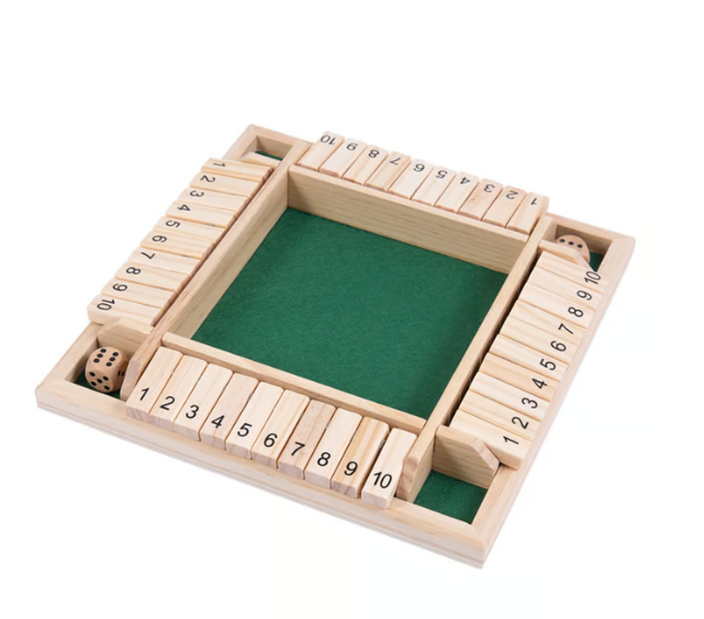 - Shut the Box peut se jouer seul ou à plusieurs. Chaque manche commence par l'abaissement des leviers afin que tous les numéros soient visibles. Ce processus est également appelé « ouvrir toutes les boîtes ». Le joueur qui obtient le meilleur résultat aux deux dés commence.