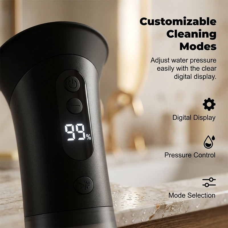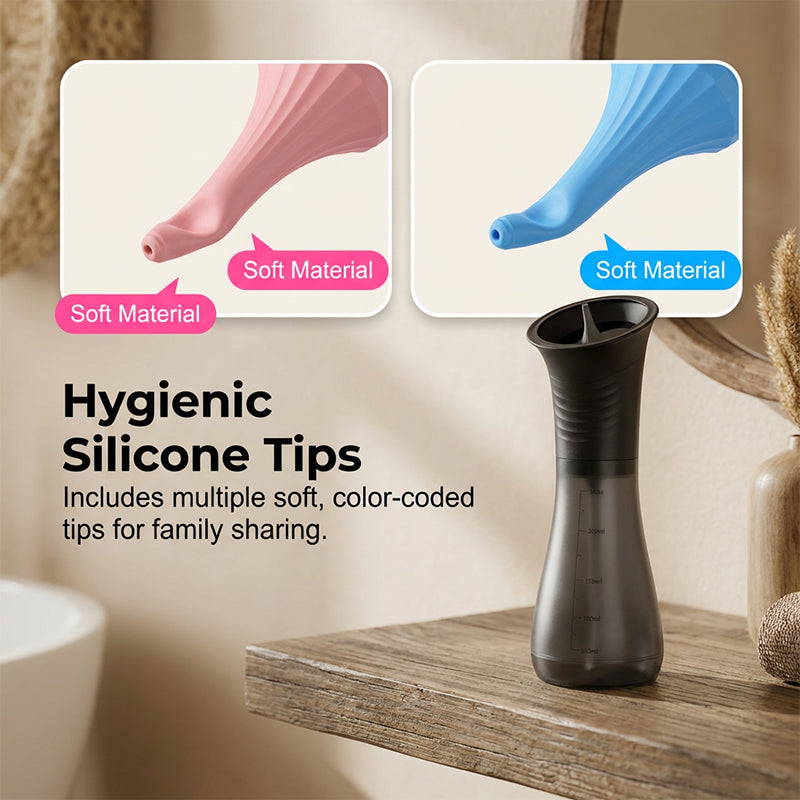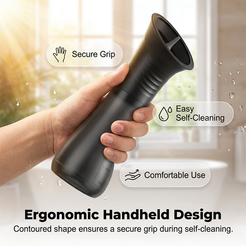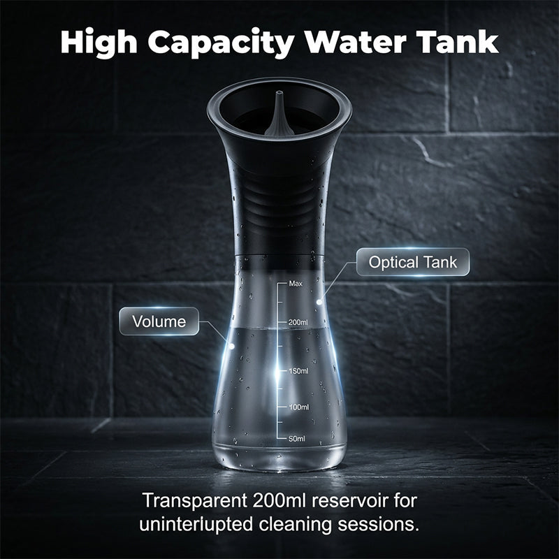 GRAND SYSTÈME À DOUBLE RÉSERVOIR - Dispose de réservoirs séparés de 230 ml pour l'eau propre et l'eau usée. Cette conception garantit une séance de nettoyage hygiénique et ininterrompue sans avoir à s'arrêter pour remplir, offrant un confort et une propreté ultimes.