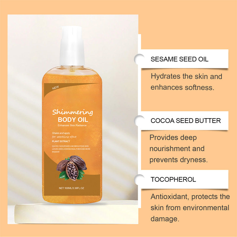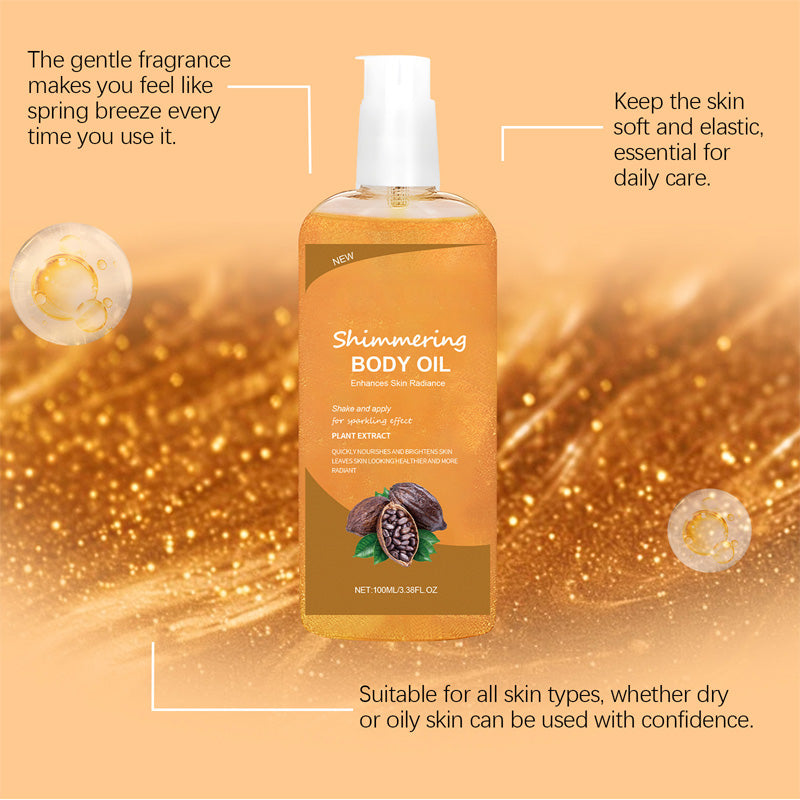 RADIANCE INSTANTE & ; HYDRATION PROFONDE: Obtenez un éclat lumineux tout en conservant l'hydratation pour une peau douce et soyeuse. Enrichie en vitamine E et en extrait de cacao, cette huile corporelle nourrit en profondeur sans être grasse, ce qui la rend parfaite pour un usage quotidien.