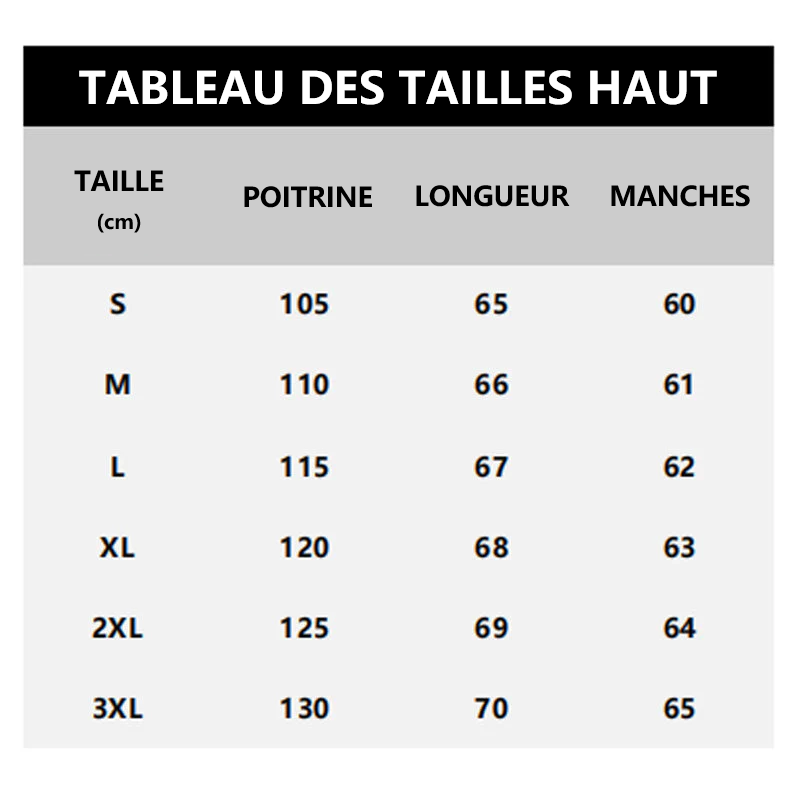 (Par exemple, si votre taille de haut est M et votre taille de pantalon est L, veuillez sélectionner la taille M lors de votre achat.)